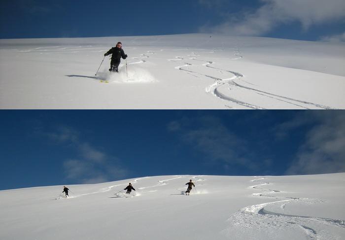 19 janvier : par des conditions assez sensibles (les couches successives de neige fraîche sont-elles bien consolidées ?) nous avons remonté avec Franck et mon collègue Eric, les belles combes et croupes de la pointe de la Carmélite dans les Aravis Nord. Ce secteur peu fréquenté il y a quelques années est devenu aujourd'hui assez populaire, ce qui est logique avec un accès assez rapide et des pentes idéales pour le ski. Mais les dénivelés sont importants, et l'endroit demande de bonnes conditions, il y a de nombreux reliefs pas toujours identifiables sur la carte, qui peuvent être piègeux. Nous avons fait demi-tour sur une antécime vers 2350, Franck devait embaucher à 13 h ! Et une belle poudreuse pour toute la partie intéressante, avant de rejoindre le chemin initial, glacé par les pluies...
