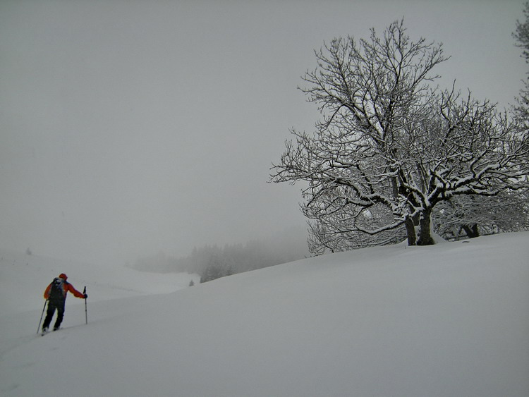 Des conditions par contre médiocres juste après la pluie en altitude, mais une très belle ambiance de solitude dans le vaste cirque du désert de Platé près de Flaine, le 19 janvier.