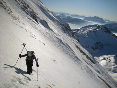 28 janvier : très belle descente d'une face assez raide et très exposée dans le versant sud de la Pointe Dzérat. Les conditions de parfaite neige de printemps ont rendu la descente assez facile, mais l'ambiance au dessus d'une barre de 80 m restait aérienne!!