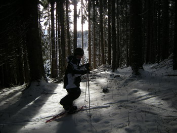 7 février 2009 : de retour à la Croix Cartier, car le temps reste humide et neigeux. 20 cm de neige fraiche et toujours cette belle ambiance de ski en forêt. Nous avons évité le jour blanc, malgré quelques déboires car les routes sont mauvaises, Robert et Mathieu sont contents !