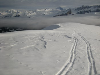16 janvier 2009 : en solitaire à la pointe de Balafrasse, en express l'après-midi. J'ai abordé la combe de Sotty, pour descendre ensuite la face ouest, au milieu des chamois. Des belles pentes dans l'ensemble, avec une neige encore très agréable, malgré quelques épisodes de vent. L'ensemble (combe de Sotty, traversée de l'arête qui mène au sommet de Balafrasse, descente face Ouest) constitue un beau concentré de ski, alpinisme et pente raide, sans difficulté majeure.