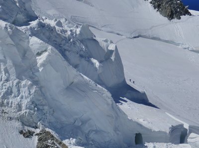 Nous sommes donc deux à entreprendre cette traversée sans encombre. Olivier profite de cette promenade pour passer dans les crevasses au pied du Grand Capucin. Nous apercevons une cordée de deux alpinistes qui se dirige vers ce pilier de granit pour y faire une des nombreuses voies. Vu également une autre cordée qui se dirige vers les Cosmiques. À l’approche de l’Italie nous commençons à chanter toutes les chansons que nous connaissons qui parle de ce beau pays. Celle qui a notre préférence est la chanson de Nicole Croisille : "il est gai comme un italien quand il sait qu’il aura de l’amour et du vin".
